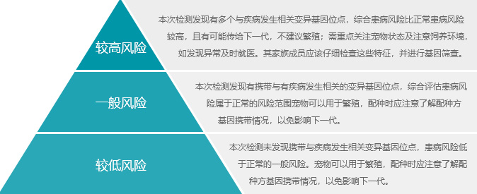 您的寵物通過本次檢測,綜合風(fēng)險評估結(jié)果顯示 骨關(guān)節(jié)炎 為較高風(fēng)險,且有可能傳給下一代,不建議繁殖;需重點關(guān)注寵物狀態(tài)及注意飼養(yǎng)環(huán)境,如發(fā)現(xiàn)異常及時就醫(yī)。其家族成員應(yīng)該仔細檢查這些特征,并進行基因篩查。